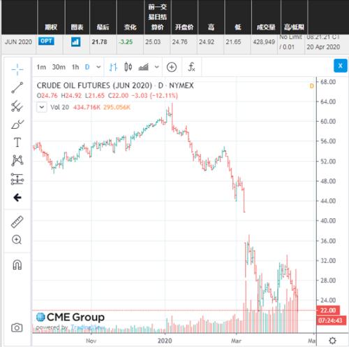 北京时间4月20日晚间,市场传出国际油价暴跌39%,跌至11美元一桶。记者查阅相关交易所报价终端发现,价格大跌的合约为纽约商品交易所的西德克萨斯原油(WTI)期货5月合约,盘中跌幅一度超过40%。该合约将于美东时间周二到期,WTI原油主力合约于2020年4月19日转入2020年6月合约。截至美东时间20日9时30分(北京时间20日21时30分),6月合约价格21.78美元,下跌12.31%。