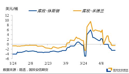 自去年美国核心产区二叠纪通往美湾的管道瓶颈解决之后,美国原油现货市场中代表核心产区的米德兰价格基本与代表管输中心的库欣价格持平,同时贴水于代表炼厂集中地的美湾价格,3月中旬美国疫情大规模爆发后,炼厂降量及产区销售压力使得美湾与米德兰价格开始大幅贴水于库欣地区,同时库欣累库压力开始显现,三地价差重新迎来再平衡,WTI交割地库欣的价格重新向产区价格靠拢。EIA数据显示的近3周库欣累库速度平均为500万桶左右,按此速度3周后将到达历史最大库存水平,并于7周后到达理论最大可用库容。
