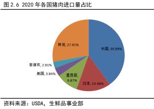 从各国进出口量来看,2019年全球猪肉贸易量为933万吨,同比增长13%,预计2020年全球猪肉贸易量1048万吨,同比增长12%,近两年全球贸易增量的主要原因为中国进口量的大幅增长,在全球猪肉贸易中,欧盟、美国、加拿大等国家为猪肉主要出口国,分别占全球猪肉出口量的37.22%,32.36%,13.12%,中国、日本等国为主要猪肉进口国,分别占全球猪肉进口量的40%,15.48%。