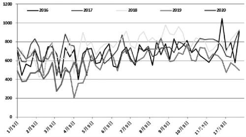 图为巴西铁矿发运量(单位:万吨/周)