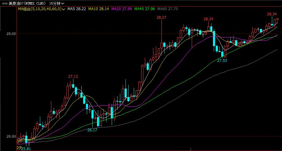 周四(5月14日)油价收高,美国原油6月期货结算价上涨2.27美元,涨幅9%,至每桶27.56美元,因美股上涨且国际能源署(IEA)预计下半年原油库存将减少;周五(5月15日)亚市盘初,美原油6月期货仍在27.56附近徘徊。