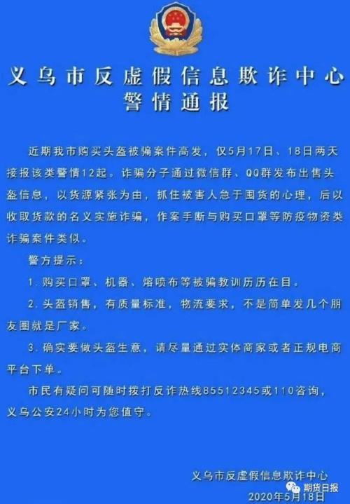 5月16日晚上,义乌市的汪先生通过微信群加了一个“卖头盔”的人为好友,对方以“意向金”为由,骗走汪先生2000元钱后“失联”。随后汪先生向警方报案。18日下午,义乌市反虚假信息诈骗中心发布敬请通报,提醒群众提防此类诈骗: