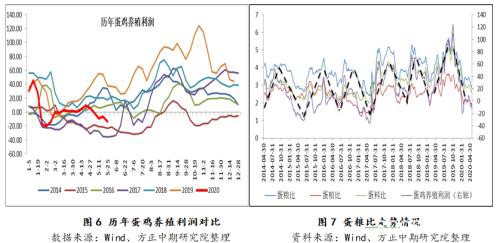 蛋鸡养殖盈利水平于鸡蛋出货价格息息相关,对于养殖户来说,蛋鸡养殖利润为每只鸡产蛋以及高龄淘鸡后的价值回收减去鸡苗和饲料成本,另外还有人工成本以及固定设施成本。截止2020年5月22日,蛋鸡养殖理论计算利润每羽-13.10元,上周为-6.42元/羽,据数据跟踪,上周五棚前鸡蛋批发价10.32元/公斤,淘汰鸡主产区平均价为6.90元/公斤。饲料原料方面,上周玉米指数周比跌0.1%,豆粕指数价格周比涨1.81%,当前盈利水平下养殖户淘汰积极增加,但下游屠宰采购量不大,2018、2019连续两年正盈利,鸡蛋产业扩张明显,也将限制产业的退出,进而将拉长蛋养殖亏损期。