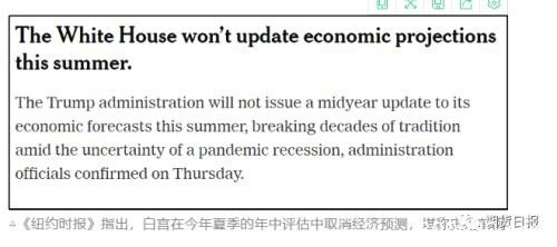 美国法律明确要求,政府必须每年夏季提供中期评估,以便对政府当年和未来经济表现作出预测,其中必须包含联邦政府的“预算收入或支出的任何重大变化”。然而白宫官员表示,鉴于目前经济处于空前状态,数据不稳对预测的指导性较低,因此今年中期评估报告将不包括年度联邦赤字预测。