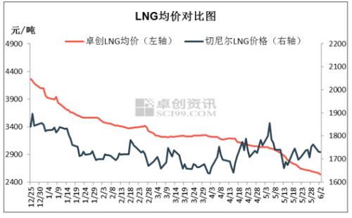 检修工厂增多,LNG价格窄幅震荡。卓创资讯对全国203家LNG工厂的监测数据显示,截至本周三(6月3日),开工厂家124家,LNG工厂周均开工率为57.4%,环比上周减少2.71%。LNG工厂周均日产为7317万立方米,环比上周减少205万立方米。