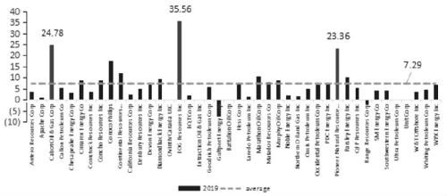 当然,在这个42家公司组成的样本当中,每家独立EP之间的营收具有较为明显的区别。以2019年为例,营收前三分别是康菲石油(Conoco Phillips)、西方石油(Occidental)和EOG,营收分别为326亿美元、204亿美元和173亿美元,较同期行业均值分别高出624%、353%和284%。因此,从行业结构的角度看,实际上独立EP大部分营收在50亿美元以下,规模庞大的EP数量不多,而且规模显著大于行业平均水平。