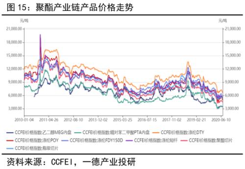 1. PTA/MEG大跌后低位运行 上半年商品包括PTA/MEG在内主要受疫情影响,春节后出现大幅跳空低开,但随即受对国内疫情管控到位以及对后期经济恢复的预期,PTA/MEG价格开始反弹。但进入3月份国外疫情相继爆发,对于外向型产品特别是聚酯产业链受打击最为严重,同时由于国际经济活动戛然而止导致原油需求下滑叠加沙特俄罗斯价格战导致原油断崖式下跌,化工成本支撑塌陷,PTA/MEG亦出现大幅下跌。随后随着对欧美复工预期的增强,同时部分化工品亦跌破成本导致供给收缩(PTA高加工费,但产业链利润屡创新低,估值相对低;EG跌破煤化工现金流),化工品企稳。随后原油出现联合减产开始反弹,对于化工品企稳反弹亦起到了助推作用。 2. 产能严重过剩制约PTA/MEG反弹幅度 从3月30日左右的商品大底到目前价格来看,原油涨幅最大为63.21%,其次是聚烯烃在30%左右,而聚酯板块PTA/MEG相对弱势在8.71%和10.73%。之所以聚酯板块PTA/MEG反弹较弱一方面受制于需求(疫情对于聚酯开工的影响主要集中在2-3月份,随后聚酯开工恢复尚可,对于PTA/MEG直接需求影响相对较小,但对于终端订单的影响影响较为严重,远比聚酯严重。主要由于终端虽然订单差,但有投机需求,这部分随后会有论述),更重要的是产能投放的压制。PTA方面年初1月份大装置恒力250万吨以及中泰120已经投产,在没有疫情影响需求的情况下本已过剩。MEG方面浙石化75万吨以及恒力90万吨在2月份开车,同时海外装置投产叠加疫情影响需求,把一些货源挤到中国导致MEG进口数量较高(美国、加拿大、伊朗、科威特)。导致PTA/MEG库存不断累积,PTA库存历史高位,MEG港口库存新高。最终抑制PTA/MEG反弹的高度。 二、疫情抑制需求,后期恢复道路坎坷 1. 聚酯产能/产量增长尚可 聚酯方面,今年产能投放依然不少,2019年新投产能在358万吨左右,产能增长率在6.5%,但今年聚酯开工同比偏高,产量增长率预计在9.18%左右。2020年预计投产的产能依然较多,初步统计有673万吨,上半年已经投产308万吨,预计下半年投产200-300万吨(考虑部分装置由于当前亏损推迟投产),产能增速9%左右,增速仍算是比较高的。 产量方面看,上半年聚酯产量累计2396万吨,累计同比-0.66%,主要是由于2-3月份疫情影响下聚酯产量大幅萎缩,但5月份开始聚酯产量已经逐步回归至正常水平。如果按照乐观的开工(即聚酯开工在90%以上,下半年聚酯新增250万吨产能),同时考虑下半年聚酯产能增长,预计全年聚酯产量在5223万吨左右,产量增速在4.37%,下半年产量增速在9%左右。 当然如果偏悲观一点(聚酯开工偏低,下半年聚酯新增产能150万吨且在四季度),下半年产量增速预计在4.9%左右,全年产量增速在2.25%。 2. 织造恢复之路坎坷 (1)终端投资收缩 从终端纺织业固定资产投资额来看,其与纺织业利润有一定的相关性,2017年下游纺织利润开始好转(有终端喷水织机等因为环保淘汰的因素),我们也看到下游固定资产投资开始反弹,2019年利润开始见顶回落(尽管江浙部分织机淘汰,但转移至内地的产能较多,且产能成倍放大。异地转移织造产能陆续投放),终端固定资产投资亦出现放缓,在没有疫情之前终端投资已经进入负值区域,疫情再次导致投资热情雪上加霜。 这从终端加弹机新增的数量亦可以得到印证,2016年新增加弹机依旧较少,但2017-2018年加弹机爆发式增长,不过进入2019-2020年,加弹机增速出现明显下滑。 (2)内需恢复尚可,但外需仍存变数 疫情导致国内消费跌至冰点,2-3月份服装纺织品类消费同比都在-30%以上的跌幅,进入4月份后随着国内疫情的缓解以及复产复工的逐步展开,国内消费开始逐步回暖,特别是5月份服装消费数据较好,同比-0.6%,接近恢复至去年的水平。 从外需的数据来看并不理想,尽管纺织+服装的数据看起来恢复不错,但拆分来看主要是纺织品出口销量暴增,源于国外对防疫物资进口的大幅需求。而服装出口累计同比数据截止5月份仍是继续走低至-22.8%。 作为外向型行业的纺织服装行业,出口需求占总需求的四成左右,因此外围需求对于整体需求的影响较大,而此次影响外围需求的主要因素就是疫情。站在当前的时间节点,国外疫情又有抬头的趋势,特别是美国、巴西、印度等新增病例再次走高,导致复工节奏受到影响,直接影响我国纺织的外单数量。同时叠加中美贸易关系的复杂性,下半年外单需求虽有向好的预期,但复苏之路充满坎坷。 上半年包括聚酯在内的多数化工品绝对价格出现了历史低点,特别是原油价格出现负值后,在绝对价格超低的吸引力下社会抄底意愿浓厚,终端产业甚至非产业人士均进场抄底(一方面今年资金成本低,央行放水;一方面原料单价低,同样的资金可以买更多的货),致使我们看到了前期聚酯较高的开工但是库存并不高。导致的结果就是下游原料+成品库存逐步走高。 但是这样会挤占下半年终端投机需求的空间,如果下半年真实需求不出现恢复,指望投机需求来支撑聚酯较高的开工会非常困难。 三、PTA供应压力公认的大 1. PTA产能增速过快是压制行情的主要症结 从投产周期看,PTA2019年产能增速7%,2020年预计22.3%。下游聚酯产能2019年增速6.54%,2020年乐观预计9.56%左右。总体看PTA产能增速大于下游聚酯产能增速。 具体来看,恒力4期250万吨以及中泰昆玉120万吨在年初相继投产,这部分产能对于产量的贡献是很大的。6月底恒力5#线250万吨装置也投产,截止7月中旬左右其两条线