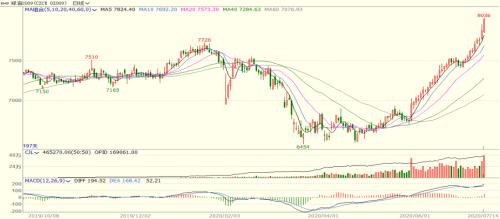 菜油期货近期持续强势上涨,多头控盘明显,本周菜油主力09合约突破8000整数关口、创七年来新高,菜油持续上涨的关键驱动来自现货供应偏紧导致投资者担忧期货仓单数量不足,预计短期现货供应偏紧格局难以缓解,资金和政策因素是决定期价走势的关键因素。