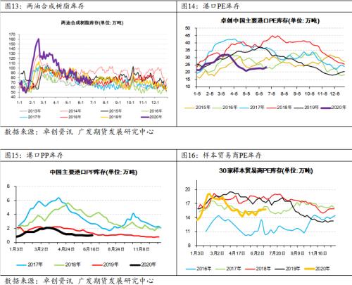受投机囤货需求、新增医疗物资需求和二季度国内需求恢复消耗库存等诸多因素影响,当前聚烯烃产业链各环节库存去化顺利,总体处于中等偏低水平,如近期两油合成树脂库存降至70.5万吨,处历史同期中等略偏低水平,另外港口PE库存在20-25万吨附近低位徘徊,港口PP库存在1-2万吨附近低位徘徊,卓创统计的贸易商PE和PP库存也处于近3年历史同期低位。2020年仍是聚烯烃新一轮投产周期大年,PE和PP产能投放速度均超15%,按道理当前国内的需求增速肯定不及产能投放速度,市场对聚烯烃累库存抱有较大预期,或者说聚烯烃产业链中等偏低库存格局大概率要改变抱有较大预期。我们认为,考虑到当前国内不少装置仍处于检修期且要等到7月下旬起开始陆续重启增加供应,前期内盘高升水外盘价格而吸引的外盘货源尚未大量到港且近期部分外盘货源到港遇阻,新产能大概率要在8月份才能逐步稳定量产以增加市场供应,故聚烯烃产业链库存特别是上游库存大概率继续去化,整体上产业链库存累积可能得到8月份逐步实现。