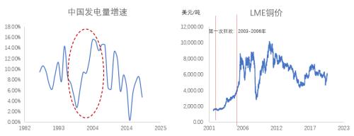 铜的消费端,随着经济以及房地产的发展,我国居民消费水平和要求不断提高,2003至2006年间,空调、冰箱、洗衣机的生产都有较大程度的增长;同时电力也在2000年后进入了飞速发展阶段,强劲的需求给了铜一针加强剂。