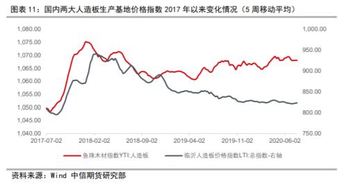 临沂与鱼珠的人造板价格在7月表现出企稳反弹,其中以内贸为主的临沂反弹幅度略大于以出口为主的鱼珠地区。雨季结束以及工人回流是近期人造板需求复苏的原因之一,但是由于同处竣工需求后端,并未表现出前端需求的强势。
