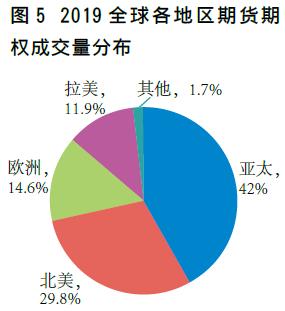 2019年,全球期货期权成交达到创纪录的344.75亿手,较2018年增长了41.66亿手,年比增幅为13.7%,低于2018年20.2%的增速。创纪录的成交是受到亚太和拉美新兴市场快速增长的推动,两地的增幅分别为20.1%和40.8%。新兴市场的印度、中国和巴西较2018年分别增长了44.9%、30.8%和50.8%,成为推动全球成交创历史新高的主要动力,这三个国家的成交占全球总成交的44.2%。