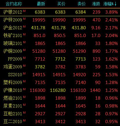 期货市场开盘大面积上涨 沪银期货主力开盘涨超3% 德昂军 • 2020年8月19日 01:28 • 期货 • 阅读 778 金融界网站8月18日讯 国内期货市场开盘,商品期货大面积上涨,沪银期货主力开盘涨超3%,沪锌、沪金涨超2%,玻璃、不锈钢、铁矿、沪铜、沪镍涨超1%。 文章作者:德昂军,如若转载,请注明出处:http://www.809030.com/futures/95047.html