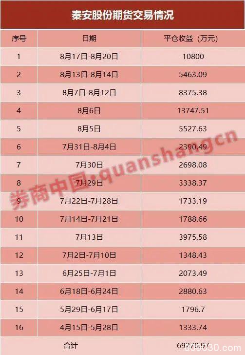 8月21日晚间,秦安股份再报喜讯,宣布最近一批期货平仓收益高达1.08亿元。