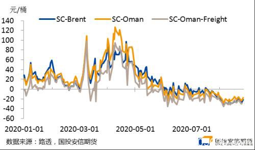 可以看出,2019年SC原油价格主要反映中东可交割油种进口成本,以Brent原油衡量的内外盘价差主要反映了运费、汇率、油品差异、交割费用等可量化的显性因素的变动。