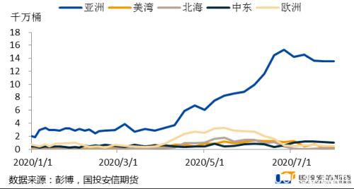 当前国内外市场基本面的相对强弱与二季度相比已有所不同,国内方面,油价已涨至地板价之上,洪涝灾害对成品油需求形成一定遏制,加之国内炼厂在前期低油价时大量抄底对下半年需求已有所透支,弱需求和高库存压力下原油采购需求相对疲软,现货到岸贴水明显承压,但国际市场在基本面边际好转不断兑现下基准价格仍相对强势。以浮仓数量为例,集中采购及港口拥堵使得亚洲浮仓数量仍处高位,但亚洲以外地区浮仓压力已明显减弱。