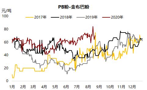 日照港(行情600017,诊股)PB粉和金布巴粉价差70元/吨,卡粉和PB粉价差50元/吨。