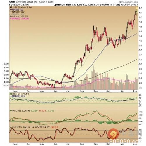 Silvercorp Metals(SVM)股价处于周期高点,且50日和200日SMA均线趋势向上。