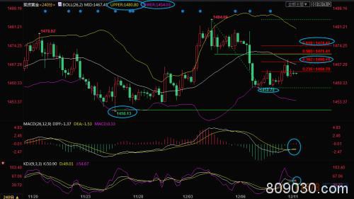 由于MACD初步金叉,若意外顶破38.2%回撤位1468.41附近阻力,则可能会进一步试探61.8%回撤位1474.41附近阻力。