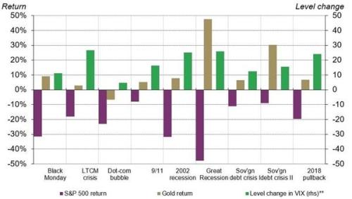 图3:标普500和黄金回报率对比波动率指数。其中紫色柱代表标普500回报率,黄色柱代表黄金回报率,而蓝色柱代表波动率指数(即VIX恐慌指数)。从中可以看到,黄金通常在发生金融危机或债务危机时表现相对较好。