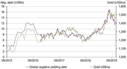 图4:全球负利率债券规模对比黄金价格。其中紫色线代表全球负收益债券总量,而黄色线代表以美元计价的金价走势。