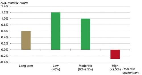 从历史上看,在美联储政策从紧缩政策转变为“保持利率不变”或“宽松”(我们目前所处的环境)后的一年中,黄金表现良好。此外,当实际利率为负时,黄金的年回报率在历史上是长期平均水平的两倍,即15.3%。即使实际利率保持在较低的正值水平,黄金的平均回报率也会出现较高增长。实际上,只有在实际利率显著提高的时期(鉴于当前的市场条件,这是不太可能的结果),黄金才会产生负收益。
