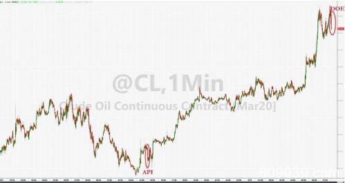 (美国WTI原油价格1分钟走势图,来源:Zerohedge)