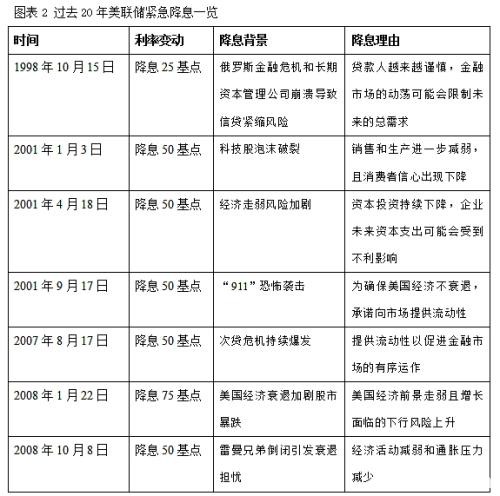 回顾过去20年美联储数次的紧急降息操作,主要原因在于应对来自金融市场的风险,除2001年9月的“911”恐怖袭击后的一次紧急降息50基点,美联储为缓和袭击事件带来的恐慌情绪,承诺向市场提供流动性。事实上美联储在上周已经有所暗示,但此次降息的速度及幅度都超乎市场的预期,选择在3月17日议息会议之前降息50基点,反映本次操作的迫切性。同时值得注意的是,美联储是在与G7国财长和央行行长会议后宣布降息,此后多家央行都追随美联储的宽松表态,这是自2008年金融危机以来全球央行第二次联手行动,这标志着全球都将进入货币宽松的低利率环境。