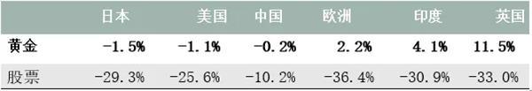 同样重要的是,尽管黄金价格通常以美元报价,但它对投资组合表现的影响是用投资者的本币来衡量的。今年迄今为止,随着全球股市的大幅下跌,包括英镑、欧元和印度卢比在内的多种货币计价的黄金都出现了正收益(表1),同时以人民币、美元和日元计价的黄金表现则为持平或略负。