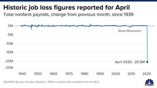 美国劳工部周五公布的数据显示,4月份美国就业市场受到了新冠病毒导致的经济关闭的空前影响,美国非农就业人数减少了2050万人,为1939年有记录以来的最大降幅;失业率飙升至14.7%,创下记录新高。