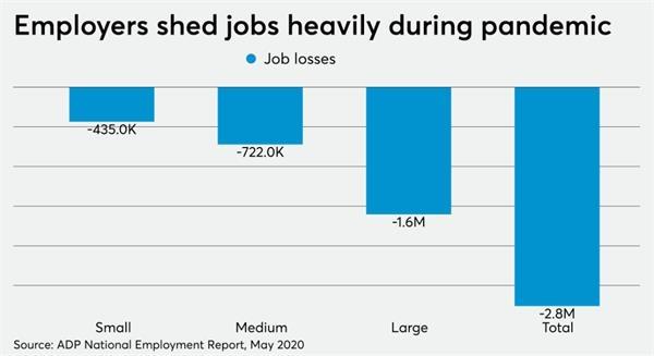 从企业规模来看,根据上个月的ADP就业报告,中小型企业受疫情的打击最大。其中,员工数在1-19人之间的小型企业在5月份共裁员43.5万人,员工数在50-499人之间的中型企业则失去了72.2万工作岗位。虽然大型企业裁员人数更多,但裁员比例相对并没有那么夸张。