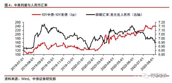 当前中美利差处于高位,近期美国两党关于经济刺激法案的分歧仍在继续,市场对于经济前景的担忧使得美债收益率又有所下行,十年期中美利差再度站上240bp。今年2月份新冠疫情逐渐蔓延至全球,对于疫情影响的恐慌使得投资者风险偏好大幅下降,疫情爆发后全球金融市场先后经历了美元流动性危机以及全球基本面冲击等多个阶段,美联储为应对“美元荒”的局面以及美国经济面临的强烈不确定性,采取了大幅宽松手段为市场提供流动性支持,在避险情绪逐渐高涨的背景下,中美利差大幅走扩至200bp以上,7月9日一度冲高至246bp。进入8月以后,由于美国两党关于经济刺激法案的分歧仍在继续,市场对于经济前景的担忧使得美债收益率又有所下行,我们可以看到上周中美利差在7月下旬小幅回落以后又再次站上了240bp的高位。