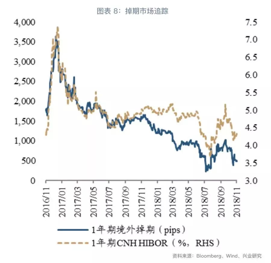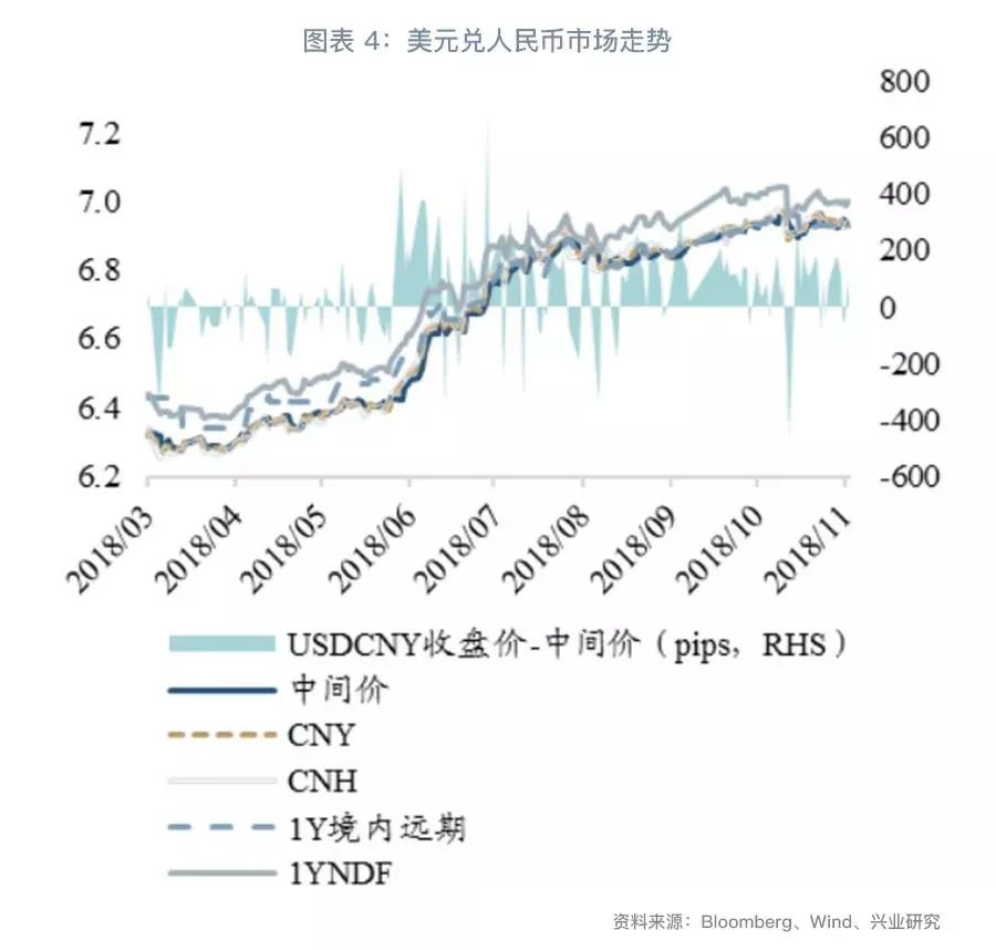 我们在《兴业研究人民币汇率月度观察:中美贸易谈判期再临20181101》中分析了中美利率倒挂的可能性及影响。总体来说,未来中美政策利率、3个月拆借利率、1年期国债收益率和10年期国债收益率都可能出现倒挂,当前1年期国债收益率如期倒挂,截止11月23日,政策利差、3个月拆借利差、10年期国债收益率差分别收窄至30bp、37bp和34bp。中美利率倒挂会通过市场预期、跨境资本流动对人民币汇率形成负面冲击。现阶段逆周期调控政策的作用下,市场对于1年期利率倒挂的反应不大,然而这实质上将当期的压力转移到“未来”,倘若利差锚向汇率的传导恢复,则美元兑人民币汇率面临升值压力。
