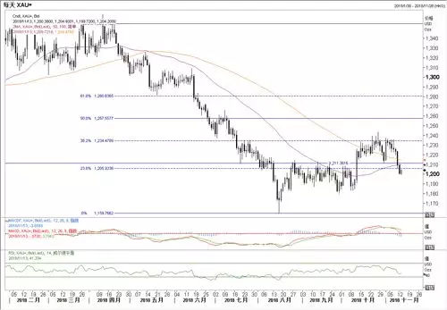 昨日黄金继续下跌9.1美元,最低跌至1199.70美元,收盘于1200.1美元。1200美元岌岌可危。昨日是美国老兵节,政府部门休假美国没有经济数据公布,美元在上破前高97.2之后继续上涨0.81%,缘于欧系货币不振,提升了美元的吸引力。英国很快达成脱欧协议的预期降温,周一英镑/美元下跌1%,至1.2848附近。此前据《星期日泰晤士报》报道,继上周五交通大臣约翰逊请辞后,英国另外四位大臣也处于辞职的”边缘”。欧元/美元盘中一度下跌1%,至1.1221,围绕连续第四天下跌。围绕意大利预算的忧虑依然令欧元承压。黄金受到强势美元的打压,现在1200美元上方苦苦支撑,如果跌破,下方目标为1190、1180美元。如果美元持续站稳在97一线上方,黄金下破1200美元是早晚的事情。本周有美国CPI、零售销售等数据,还有欧美两大央行行长的讲话和本日意大利回复欧盟2019年预算修正案。只要欧洲方面还受到意大利预算问题、脱欧谈判和德国政治不稳定影响,美元仍然会受到资金追捧,对黄金形成重压。