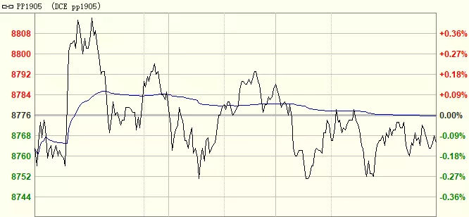 文华商品指数高开震荡,收小假阴线。国内商品涨跌参半,有色金属小幅上涨,黑色系表现平淡,原油板块三连阳。化工板块高开低走,大部分品种出现拐点形成的迹象,而三大塑料品种延续上探,PVC平稳强势,LLDPE缩量均衡,PP表现最弱。PP1905合约窄幅来回震荡,收小十字星线于8765(跌0.13%)。大盘处于敏感关键节点,PP维持看多观察。