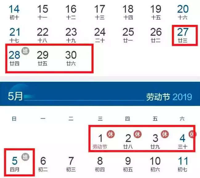 2019年5月1日至4日放假调休,共4天。4月28日(星期日)、5月5日(星期日)上班。