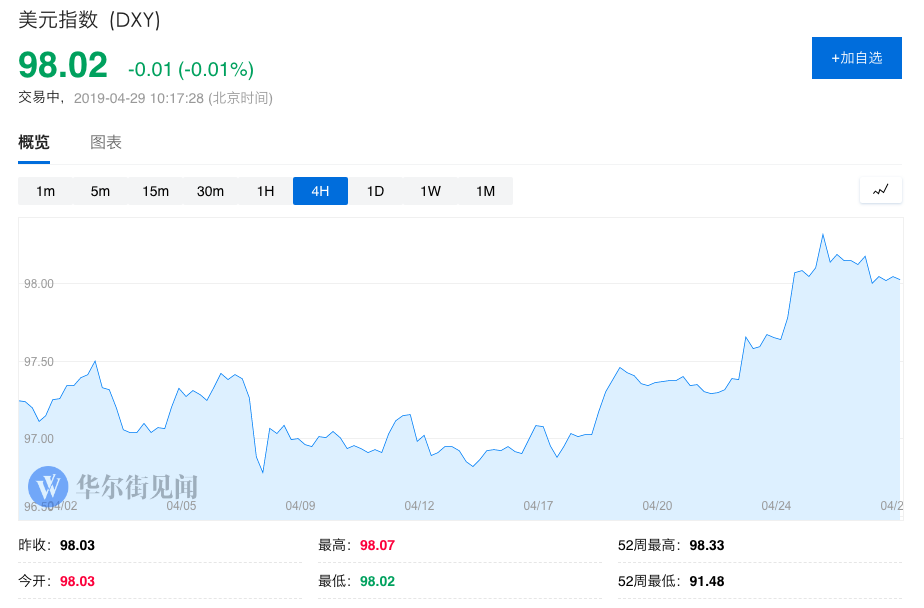 美元近期超预期走强,你认为美元的涨势到头了吗? 芭蕉扇 • 2019年4月29日 10:50 • 外汇资讯 • 阅读 1056 超低波动率的平静日子最近出现了波澜——美元开始冲破高位盘整区,向另一个高点进发。 4月24日,美元指数收于98.1,创下2017年5月以来和触底88后重新走强以来的最高水平。4月25日美元指数一度冲高至98.1789,4月26日出现下跌,但整体仍维持在98以上高位,美元走强意味明显。3月20日以来,美元指数累计上涨了2%。 图为4月以来美元指数走势: 前期由于经济超预期,政策出现微调,如果叠加强势美元,政策的变化可能会被做实。图里的分析是中信的: 文章作者:芭蕉扇,如若转载,请注明出处:http://www.809030.com/news/15312.html