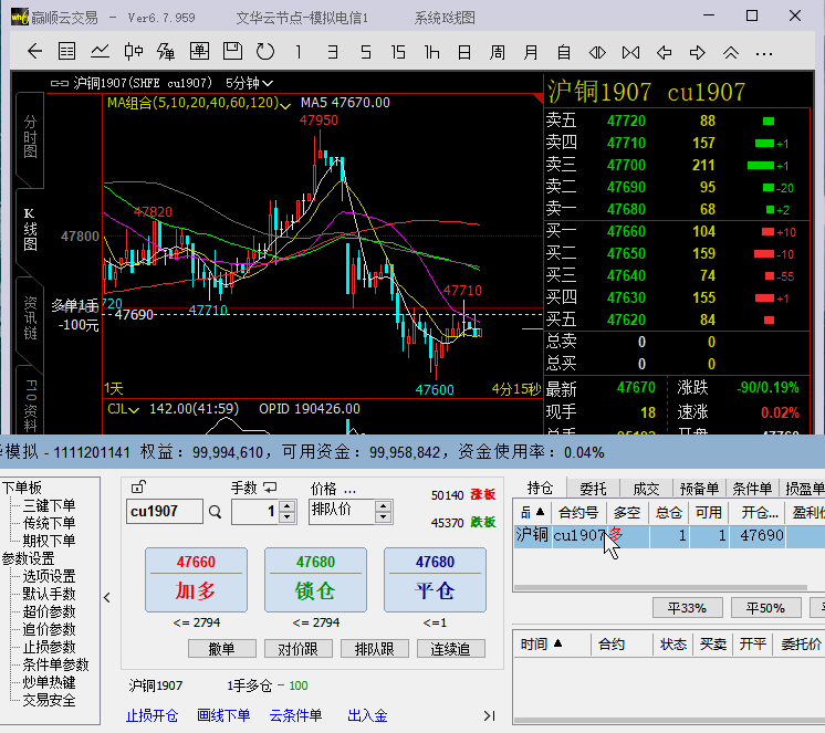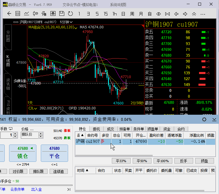 小编在47690这个价位买入了一手沪铜1907合约,经过分析和研判,认为如果沪铜1907合约跌穿47200的话,价格可能会跌的更多,或者涨回来的可能性比较小,为了避免更大的损失,小编在47200这个价位设置了止损单。