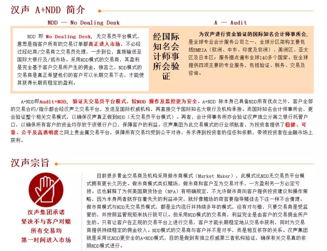 验证的意义非常重大,其有助于公众避免遭受到欺诈及确保交易商遵守法律法规并实施相应的公平政策。当客户了解到自己的资金存放在安全之处,才可免除后顾之忧。对于一家贵金属交易商来说,要满足全部验证要求是一个繁复且昂贵的过程,但我们认为是绝对有必要的。我们深信只有采取这些措施,才能为客户营造一个安全的投资环境。汉声集团作为全港首家推行A+NDD模式的贵金属交易商,致力于保障客户的资金安全。为使客户进行投资时更加放心,我们特别聘请国际知名会计师事务所验证我们所有客户资金均存放于独立分离户口,以确保客户资金之安全性。