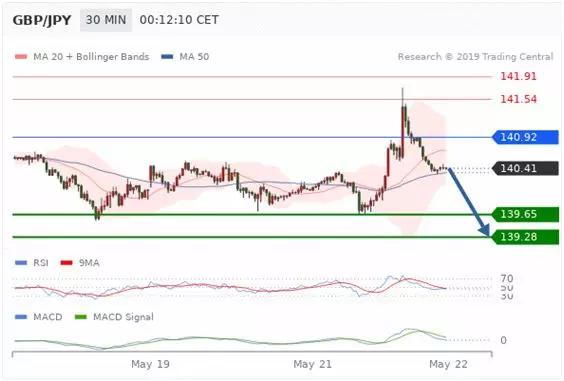 交易策略:逐渐下跌,当 140.92 阻碍上行,则 139.28 为目标位