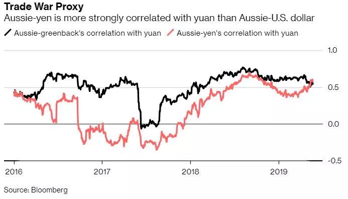 澳元与人民币紧密挂钩,因为中国是澳洲最大的贸易伙伴,购买包括铁矿石在内的多类澳洲大宗商品。彭博社编制的数据显示,澳元兑日元与离岸人民币的关联度最近一直在上升,上周关联系数升至0.60,为去年10月以来的最高水平。这比人民币与澳元兑美元的关联性更强。