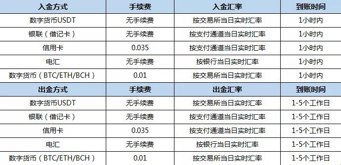 入金方式:数字货币USDT、银联、信用卡、电汇、数字货币(BTC/ETH/BCH);