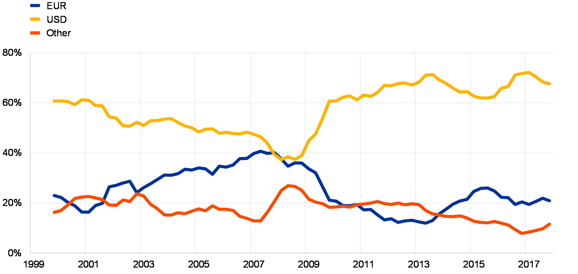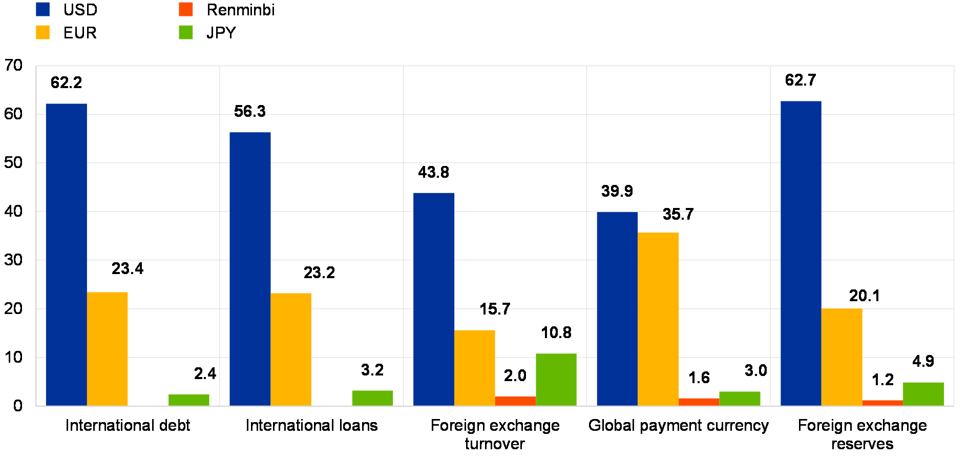 虽然跨境支付份额反映出欧元的崛起,但相比之下,以美元计算的金融债务仍占到相当大一部分。