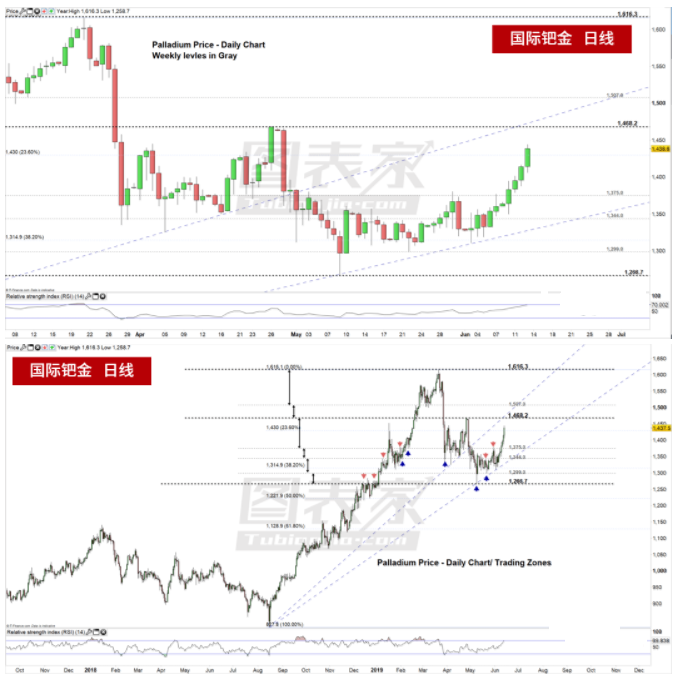 图为钯金日线走势图(分别为2019/5/7~2019/6/13和2018/6/4~2019/6/13),6月10日钯金收于1375美元上方,未来有望涨至4月26日触及的1468.2美元,若突破,则进一步阻力位见1507美元。