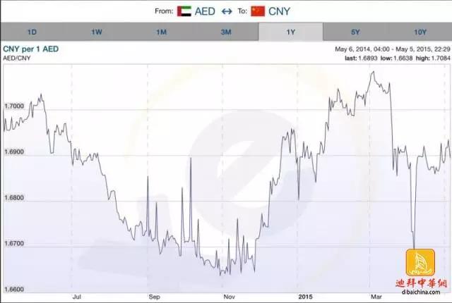 这是从去年5月份到今年5月份的迪拉姆对人民币的走势图,汇率最高的时候是1.708,最低的时候是1.6638。汇率还是有一些起伏的,但是也不算太大。汇率超过1.7的时候有两个时间段,一个是2014年的5-6月份,还有一个是今年的2-3月份。