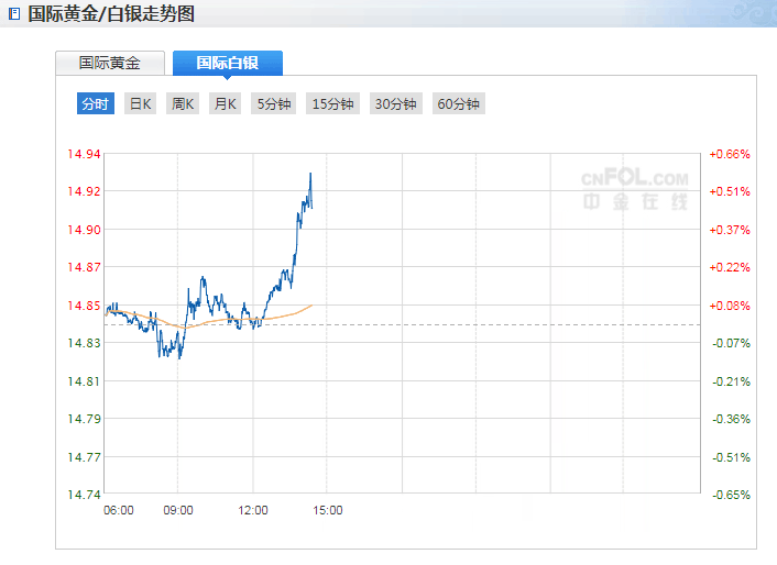 周二(6月18日)亚市午盘,国际现货白银价格短线上扬逾0.6%,现报14.908美元/盎司。