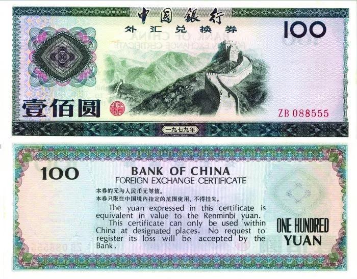 1980年4月1日国务院授权中国银行发行1979年版外汇兑换券,分为壹角、伍角、壹圆、伍圆、拾圆、伍拾圆、壹佰圆七种面额。1990年4月1日又发行1988年版伍拾圆、壹佰圆券。共计十个版别、324个冠号,其中:壹角有国旗五星版水印和火炬五星版水印两种,伍拾圆有79和88版两种,壹佰圆有79和88版两种。