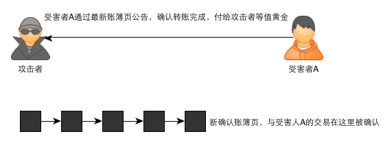 第二步,这笔交易在最新的账簿页中被确认,并被各个挖矿小组公告出来。受害人A看到公告,确认比特币到账,给了攻击者10个比特币等值的黄金。