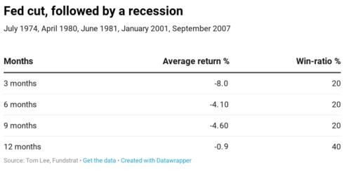 据Fundstrat回溯1971年以来的数据显示,在经济尚未陷入衰退时期做出的首次降息,100%会带动股市上涨。