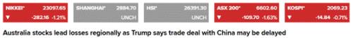 在隔夜美股全线下挫后,悲观情绪继续笼罩,亚洲股市低开低走:澳大利亚ASX200指数开盘下跌1.24%;日经225指数开盘下跌0.93%;韩国首尔综指周三开盘下跌0.63%。